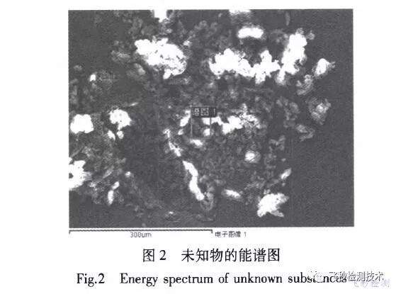 為了進一步判斷未知物中各成分的組成,選擇未知物的不同區(qū)域進行能譜試驗。圖2為未知物的能譜圖,結(jié)果表明未知物表面出現(xiàn)較大面積小分子團聚