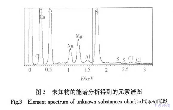 現(xiàn)象,圖3為能譜分析得到的元素譜圖,表3為未知物的能譜成分分析結(jié)果,結(jié)合兩者數(shù)據(jù)可以看出未知物譜圖1的區(qū)域中含有一定比例的C、O、Na、Mg、AI、Si等元素,未知物中添加了一定量的SiO2或者TiO2顆粒,這些無機小分子粒子在未知物表面出現(xiàn)了一定程度的團聚現(xiàn)象。