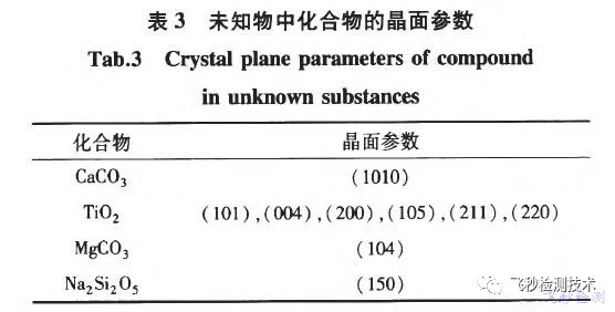 圖4為未知物的XRD譜圖,根據(jù)晶面數(shù)據(jù)和衍射峰的強度,并結(jié)合XRD譜圖數(shù)據(jù)庫,可以判斷出未知物中含有CaC03、Ti02、MgC03、Na2Si205化合物,其晶面參數(shù)見表3,結(jié)合能譜分析數(shù)據(jù)可以判斷該未知物中團聚的顆粒為TiO2。