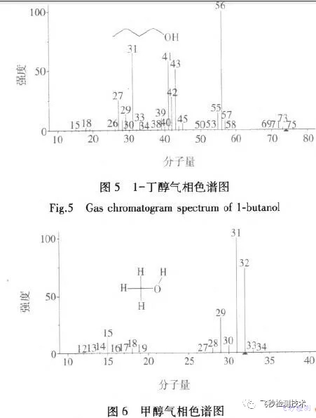 根據(jù)氣相色譜一質(zhì)譜測試結(jié)果,圖5一圖7分別為卜丁醇、甲醇和水氣相色譜一質(zhì)譜圖,可以明顯看到水、1一丁醇(C4H10O)、甲醇(CH4O)的吸收峰,結(jié)合前面紅外光譜圖,由此可以斷定未知物中包含卜丁醇、甲基丙烯酸甲酯、苯乙烯、甲醇和水。