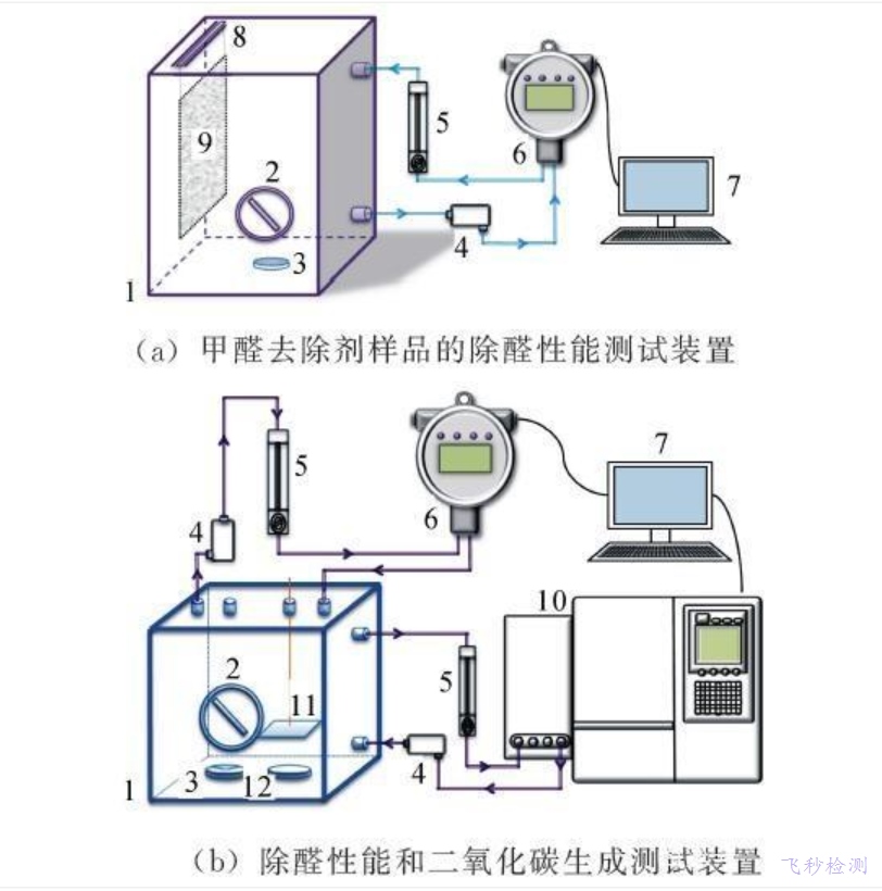 1 實驗艙;2 實驗艙門;3 風扇(上覆蓋紗布);4 空氣泵;5 流量計;6 甲醛在線監測傳感器;7 計算機;8 樣品放置窗口;9 過濾棉;10 氣相色譜儀;11 蓋子;12 培養皿